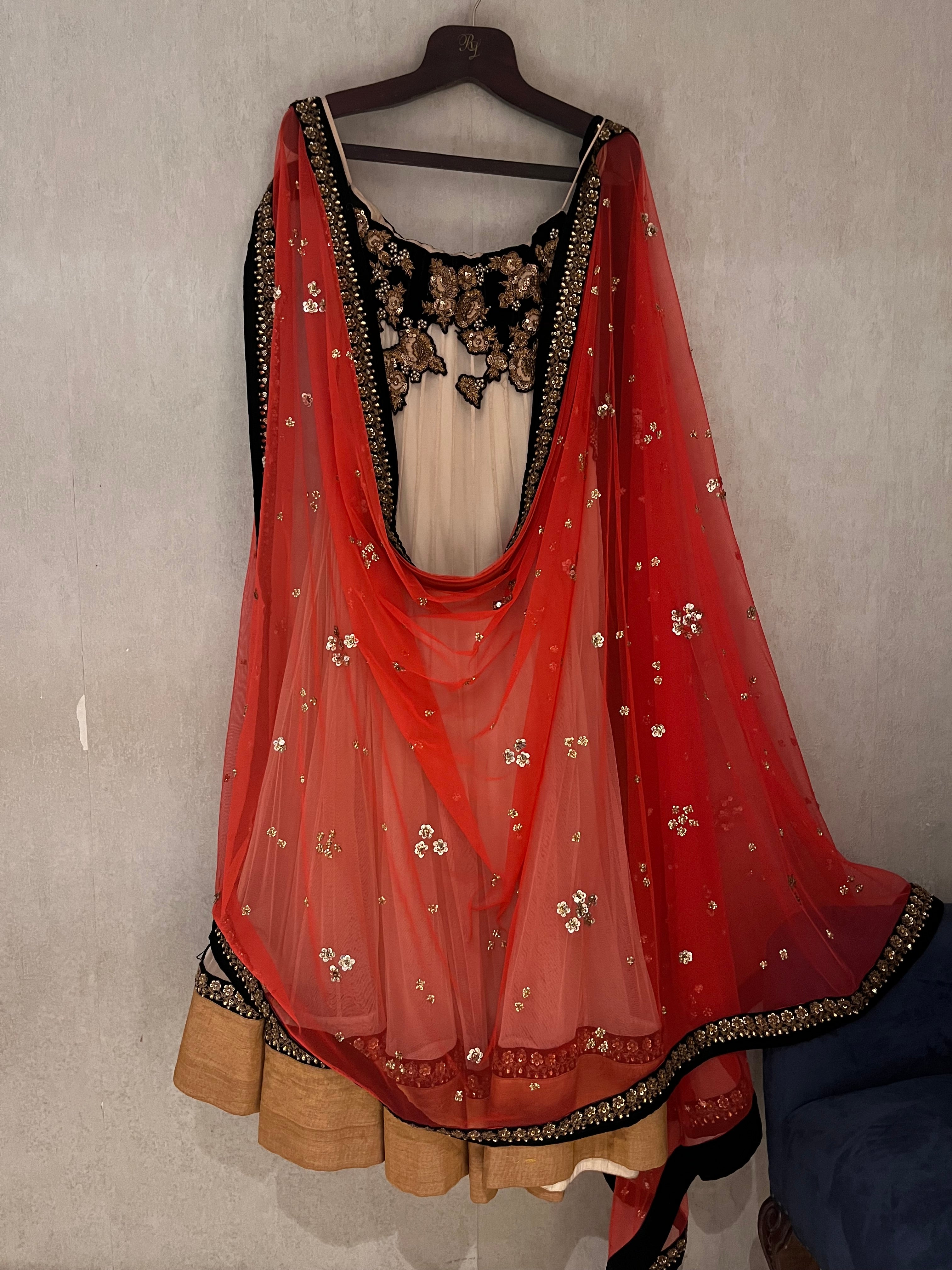 A-line lehenga set with ready made vest style blue velvet blouse and orange handwork dupatta  handwork zardozi, resham and sequins  size S