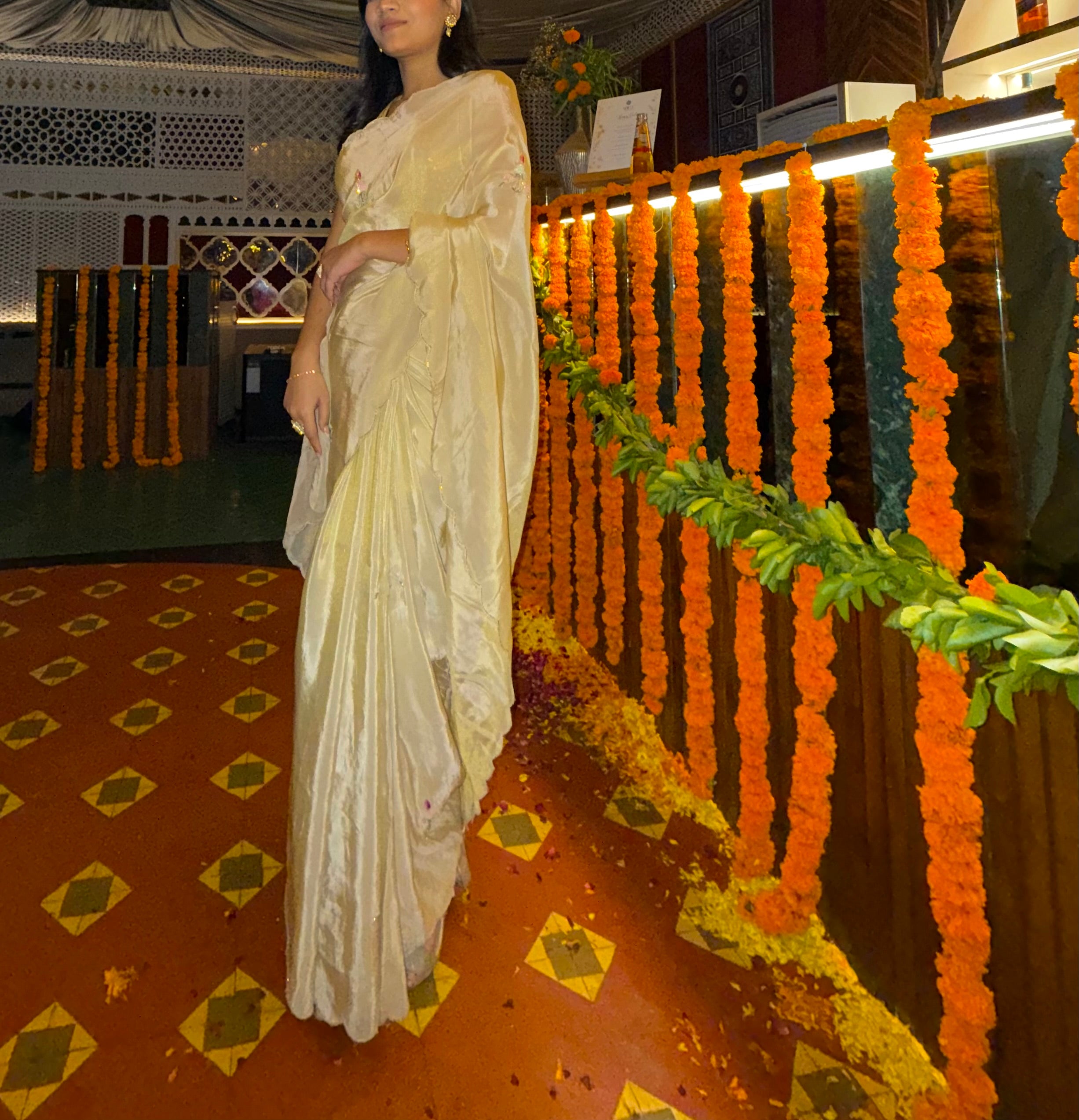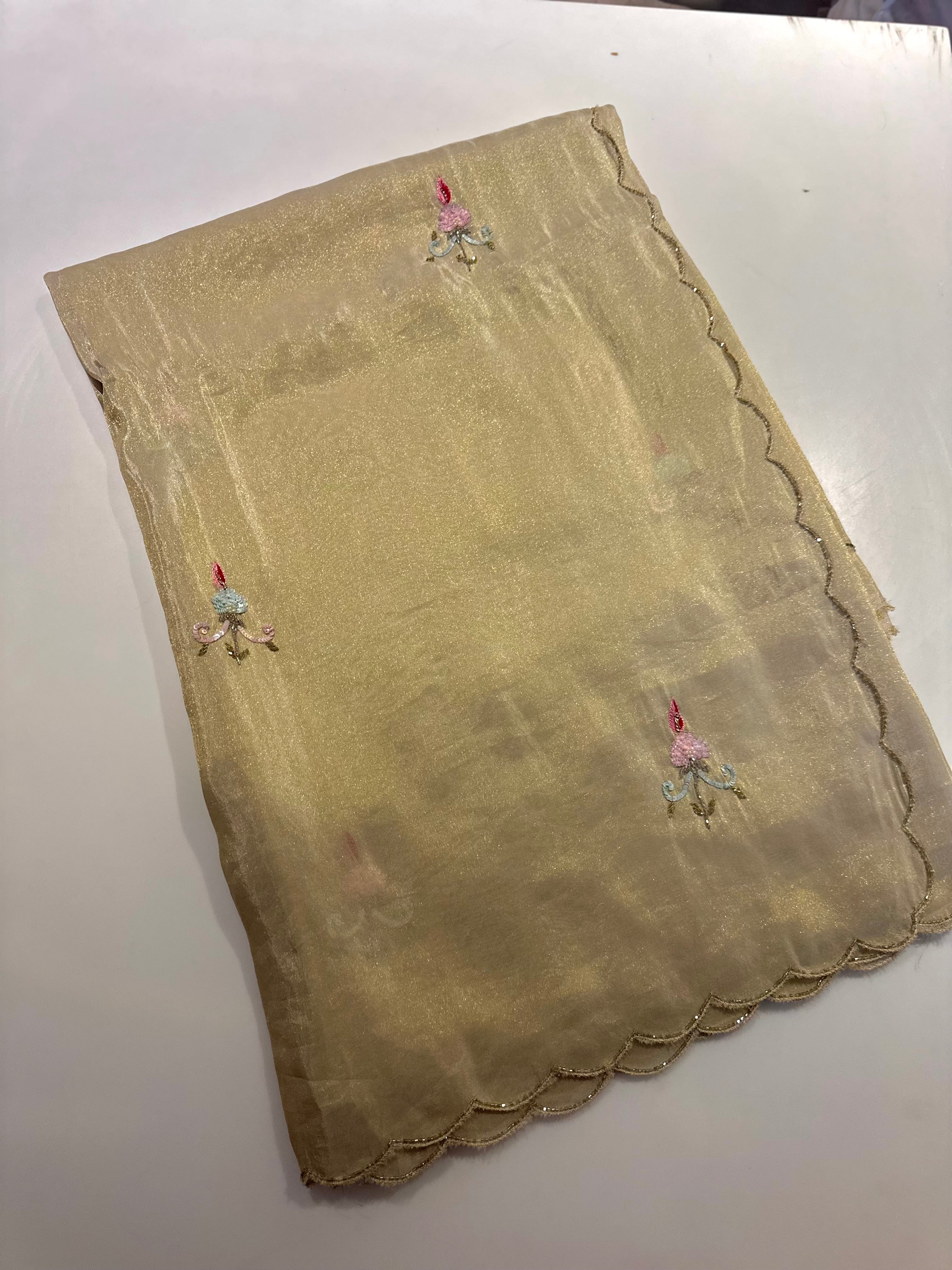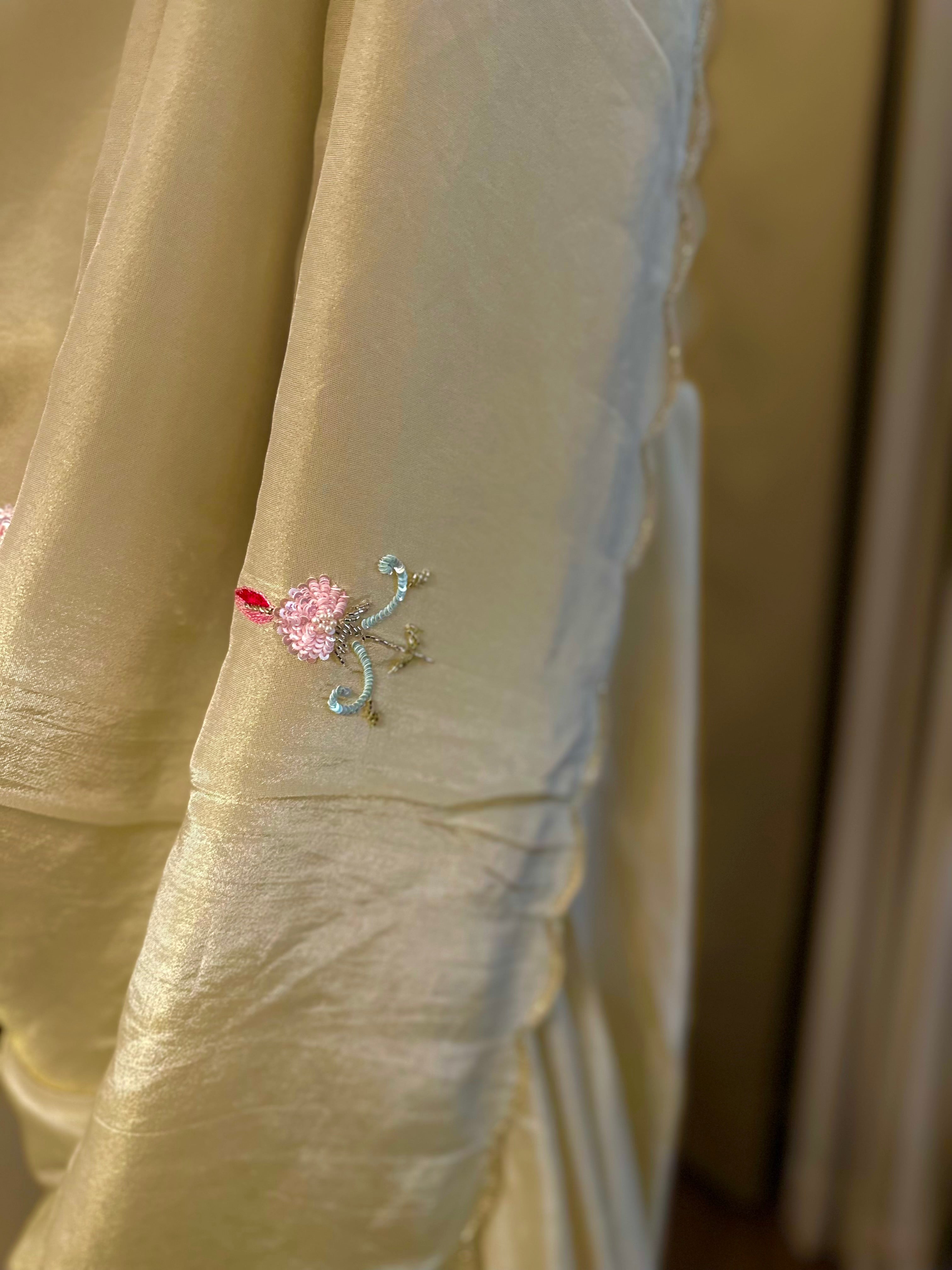Classic Gold beautiful girly elegant drape saree with subtle handwork fine motifs all over saree with cutdana handwork scallop boarder. Heavy handwork blouse.