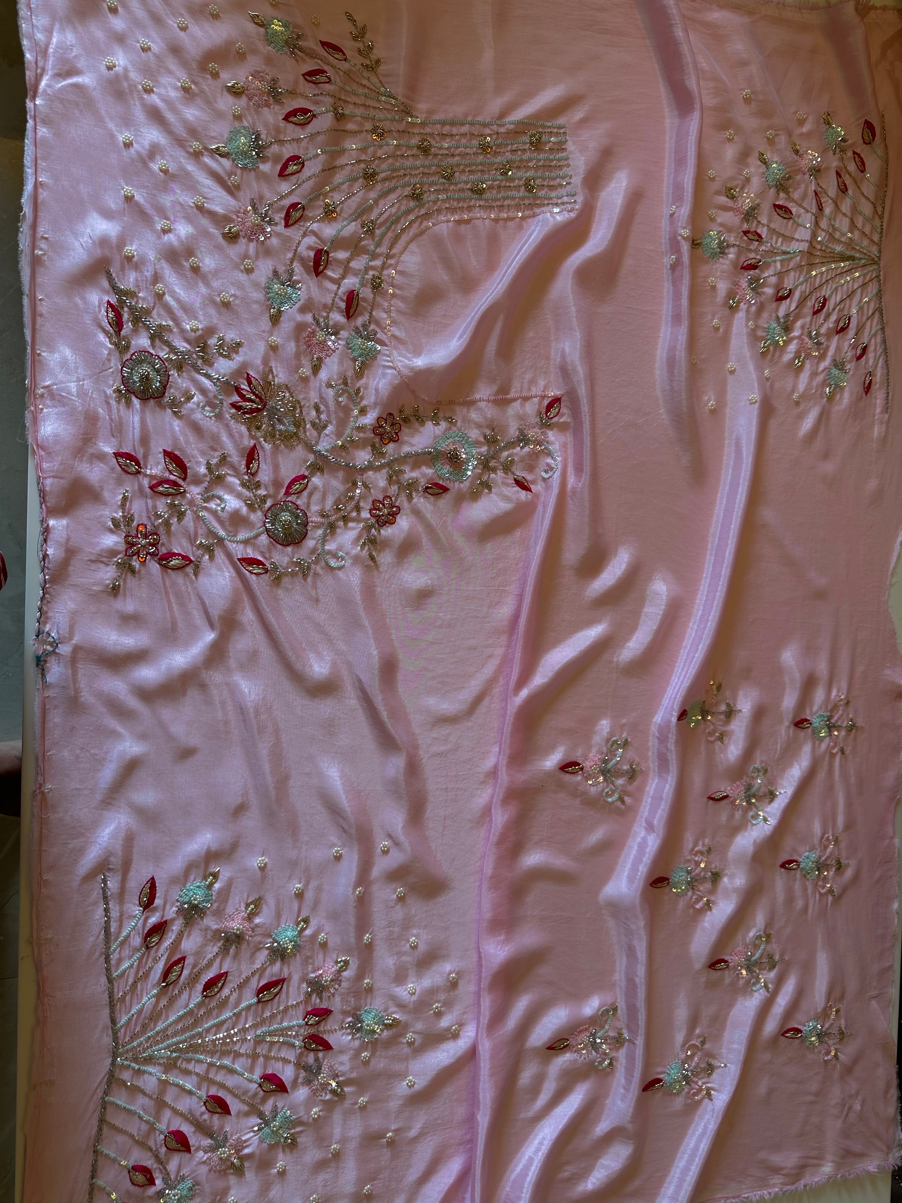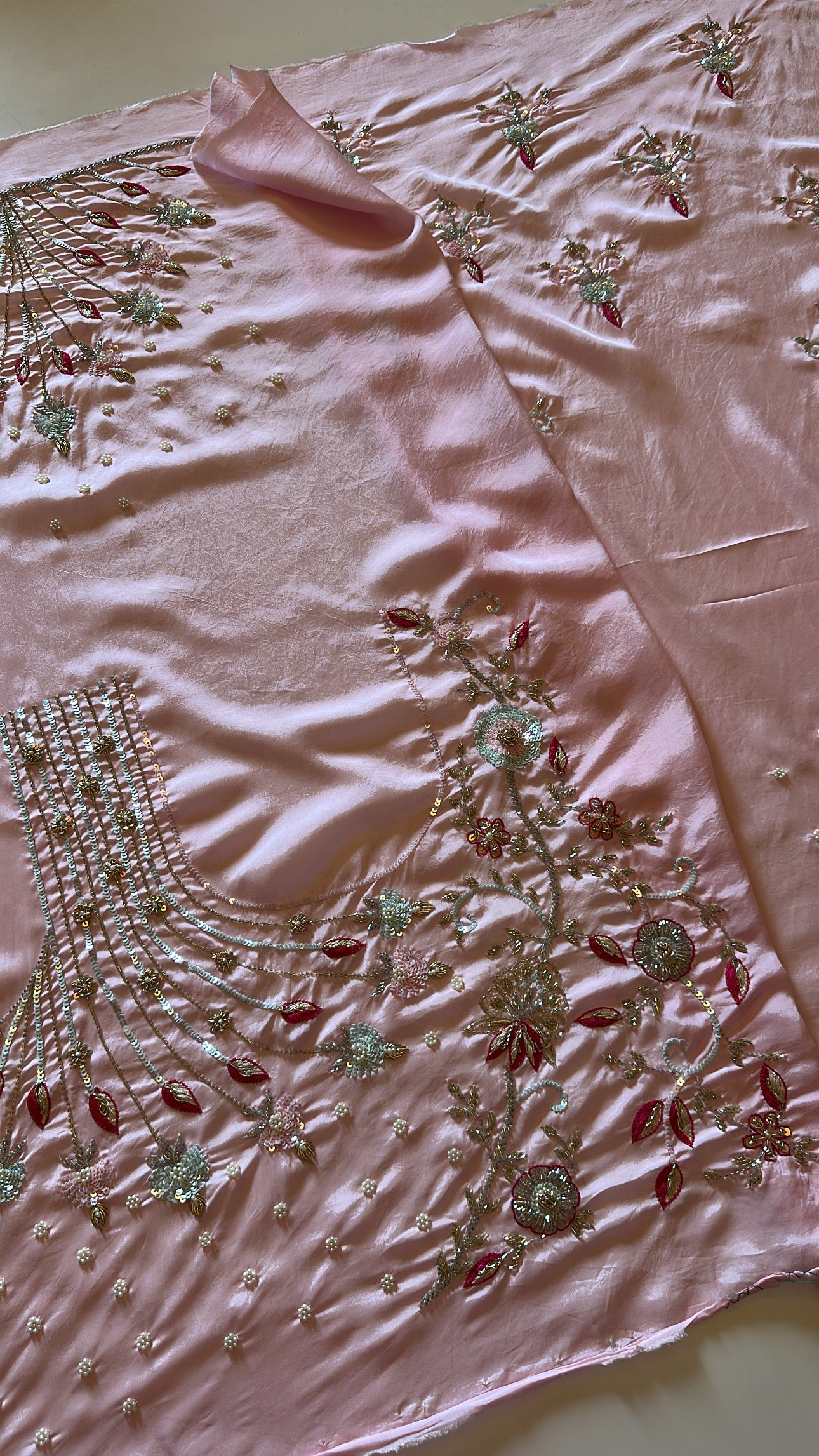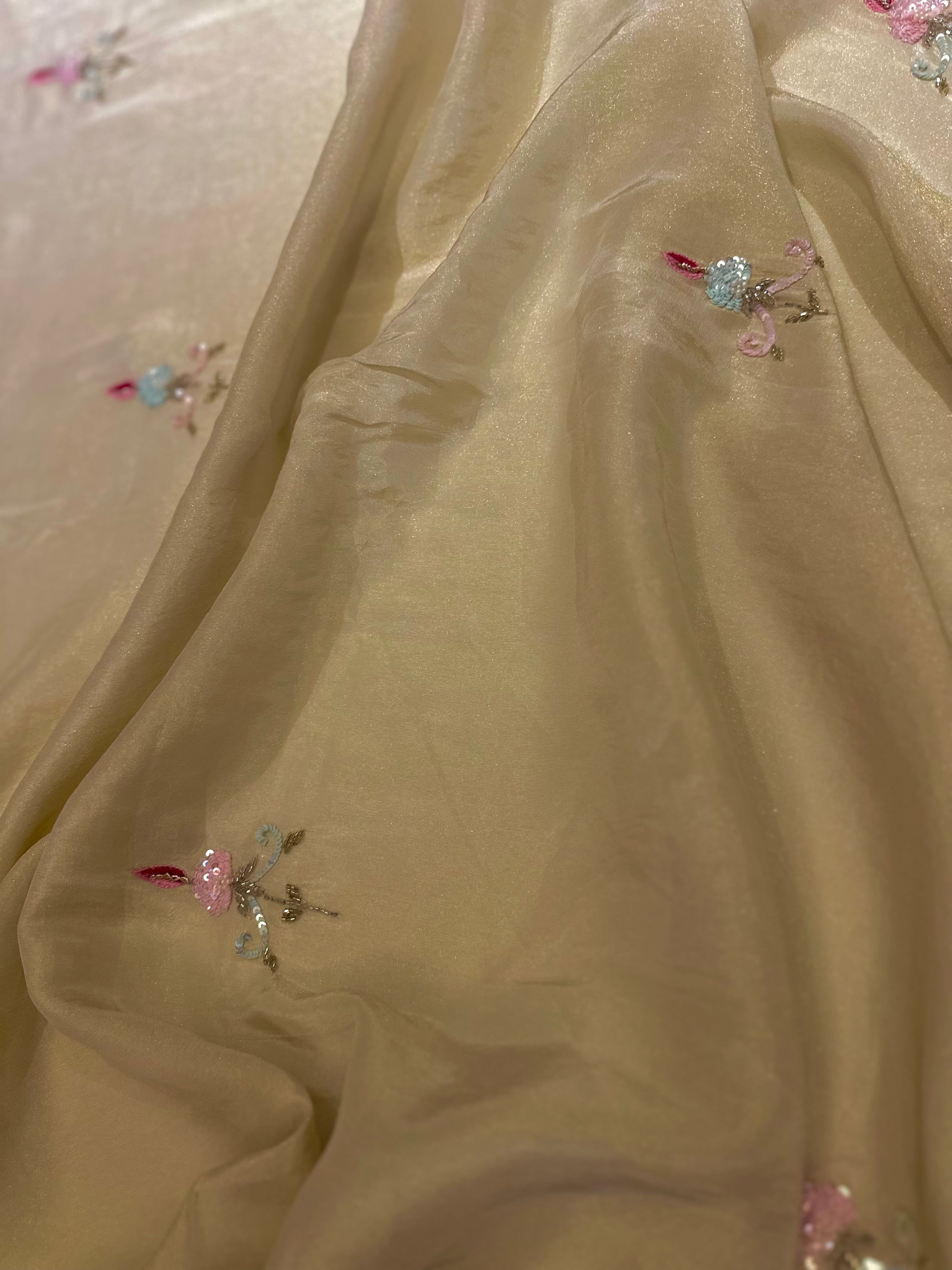 Classic Gold beautiful girly elegant drape saree with subtle handwork fine motifs all over saree with cutdana handwork scallop boarder. Heavy handwork blouse.