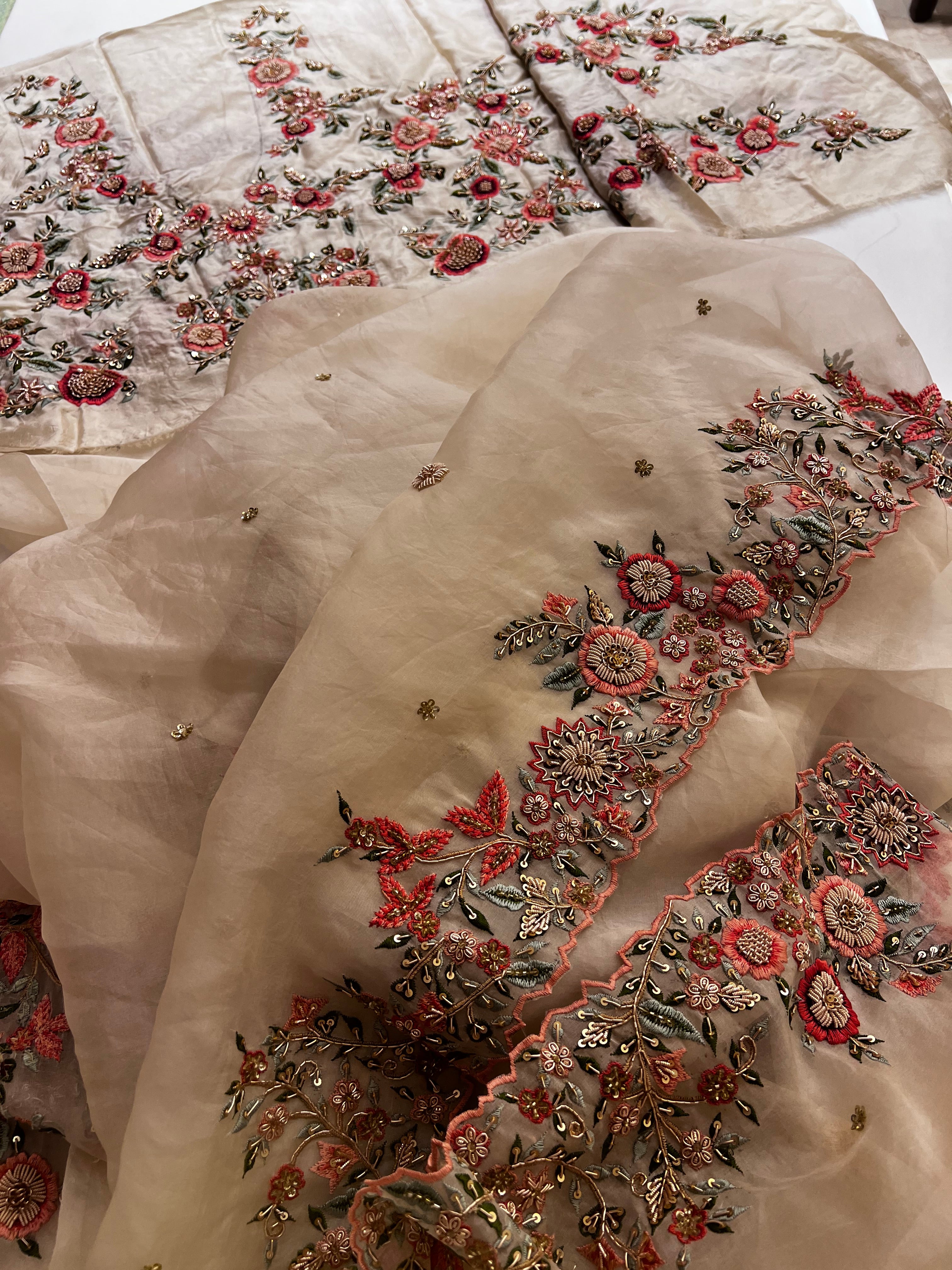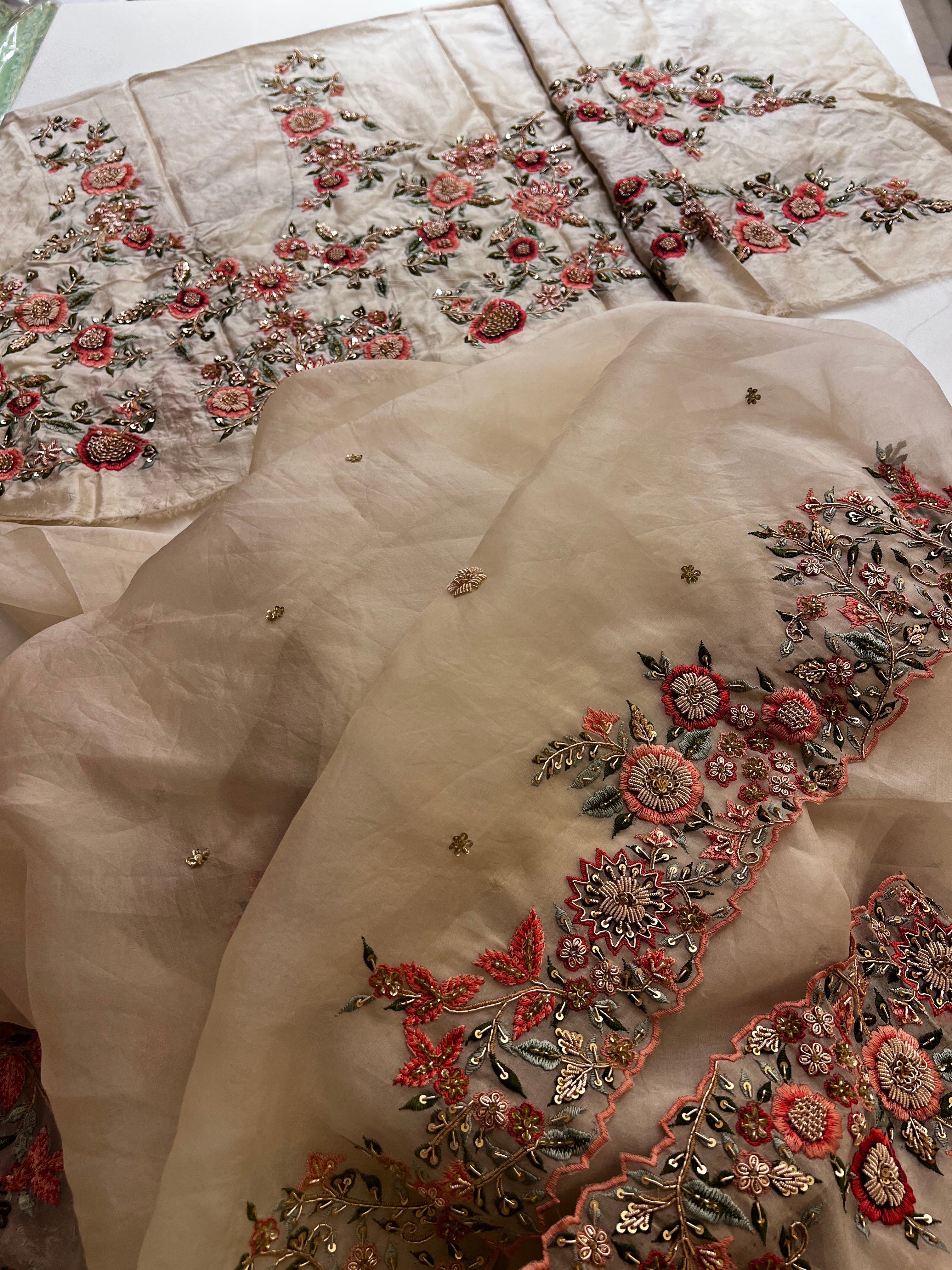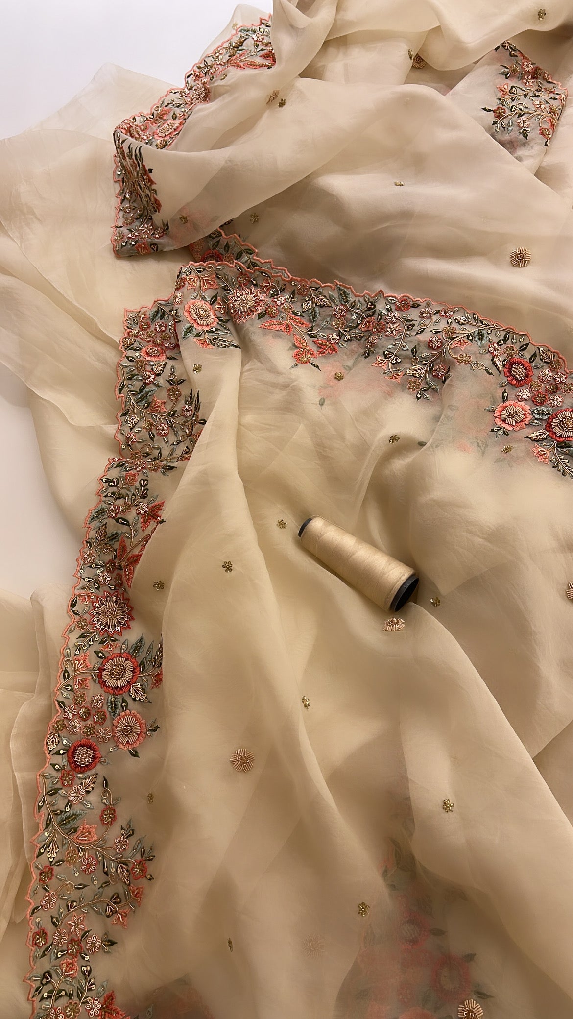 Ivory pure Organza saree with heavy bridal look blouse, handwork Zardozi with Resham,sequins, Cutwork boarder.