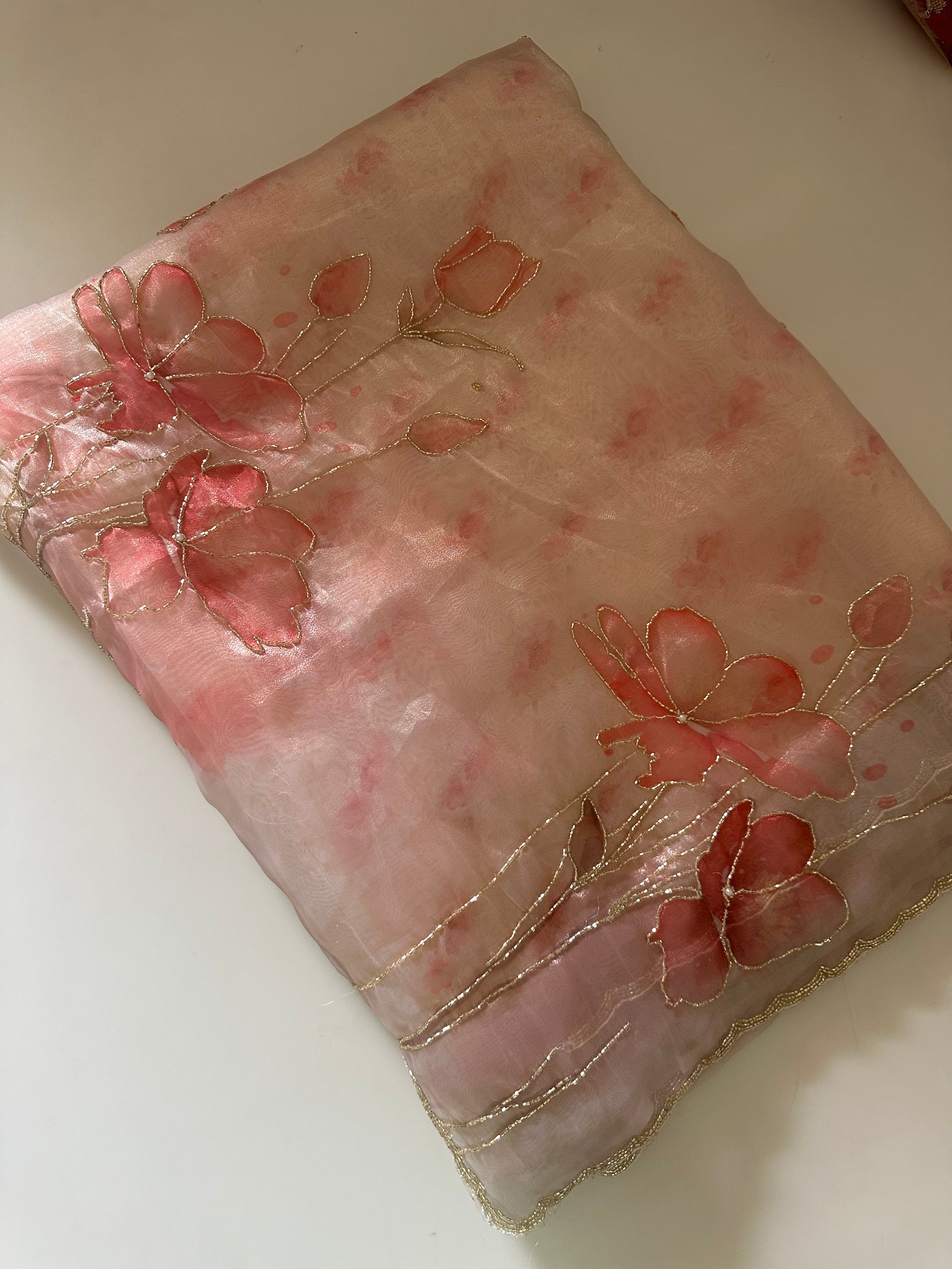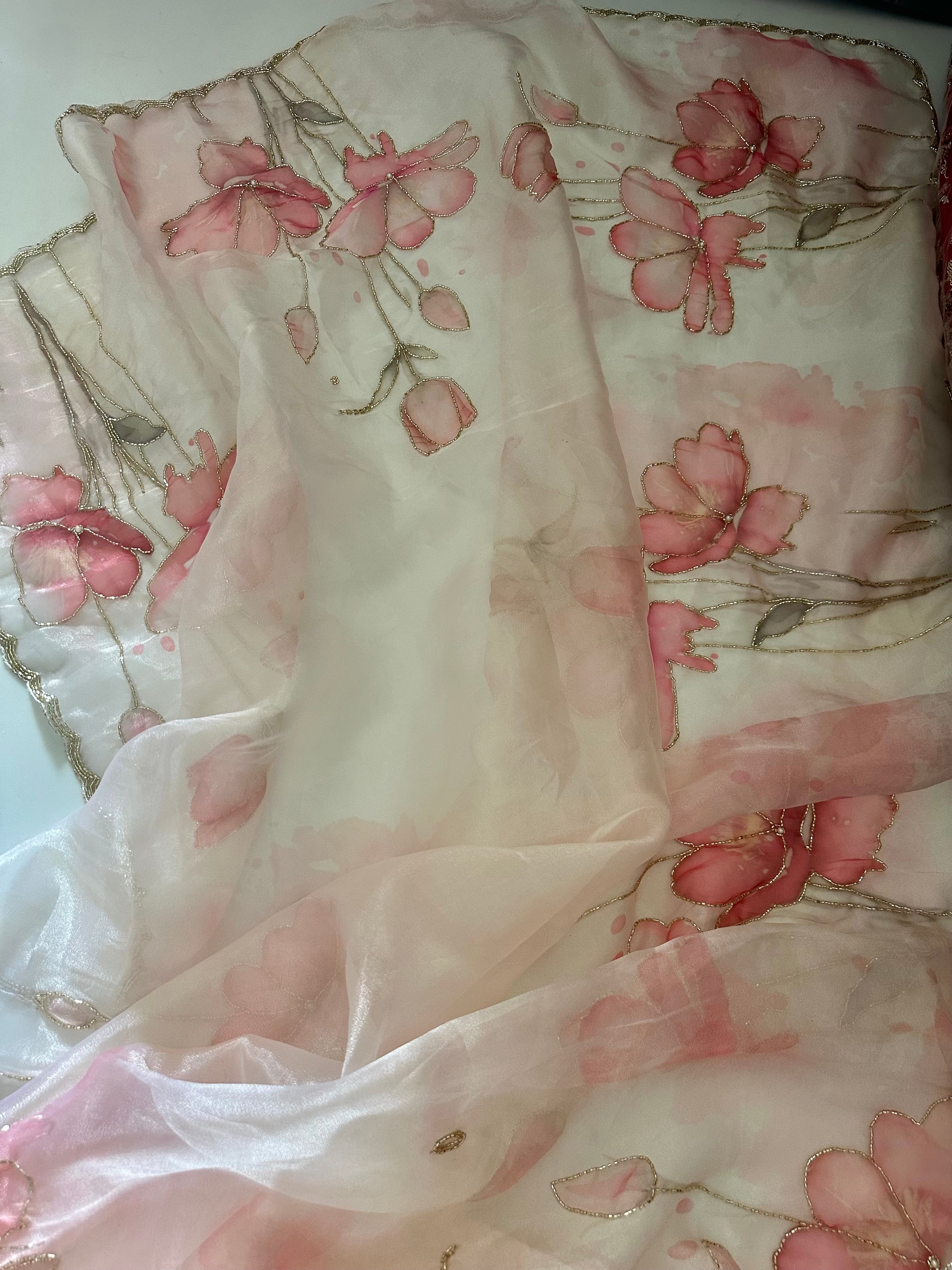 Classy and Elegant Floral Printed handwork cutdana highlights with handwork cutdana boarder organza saree with blouse.
