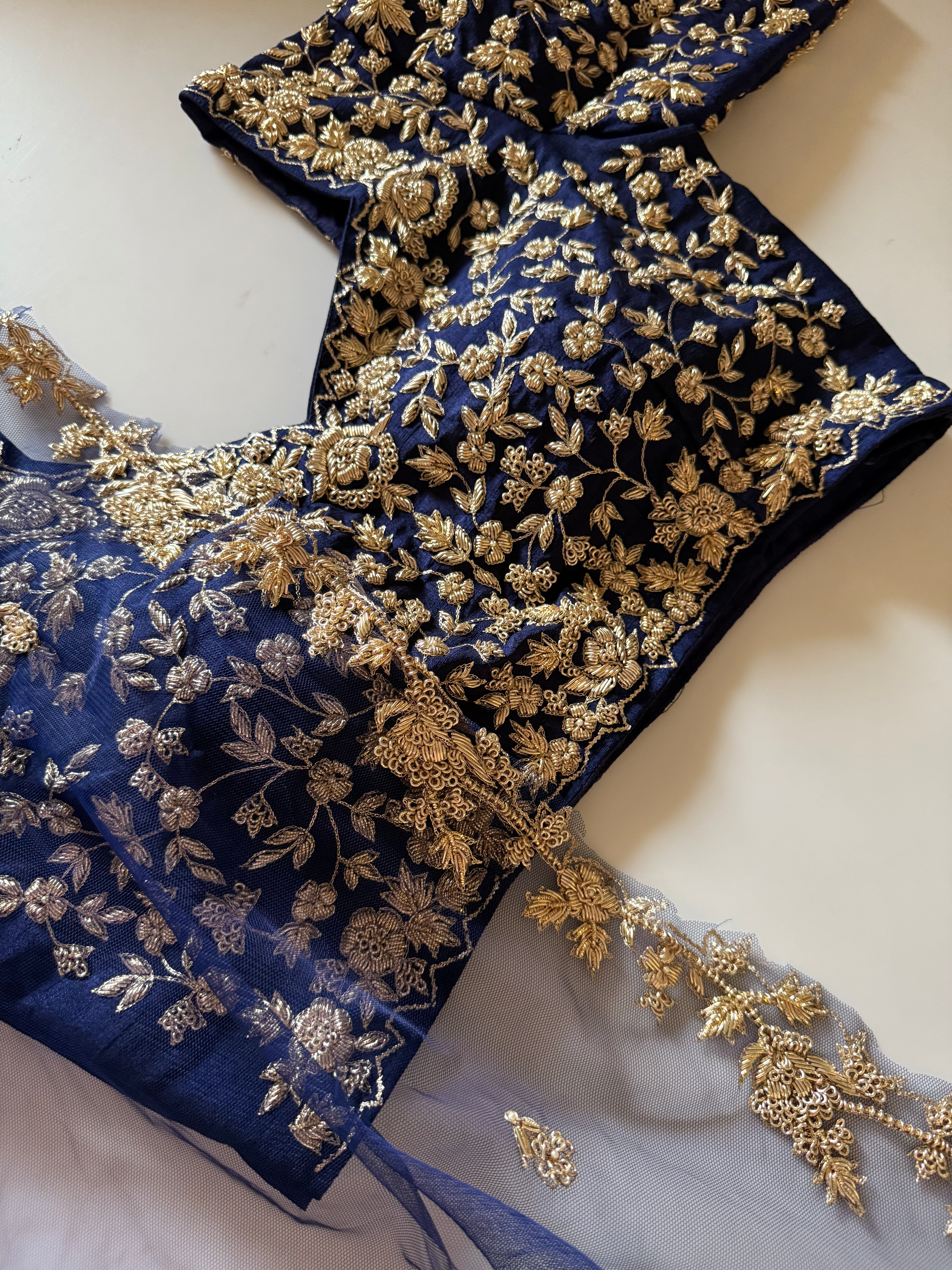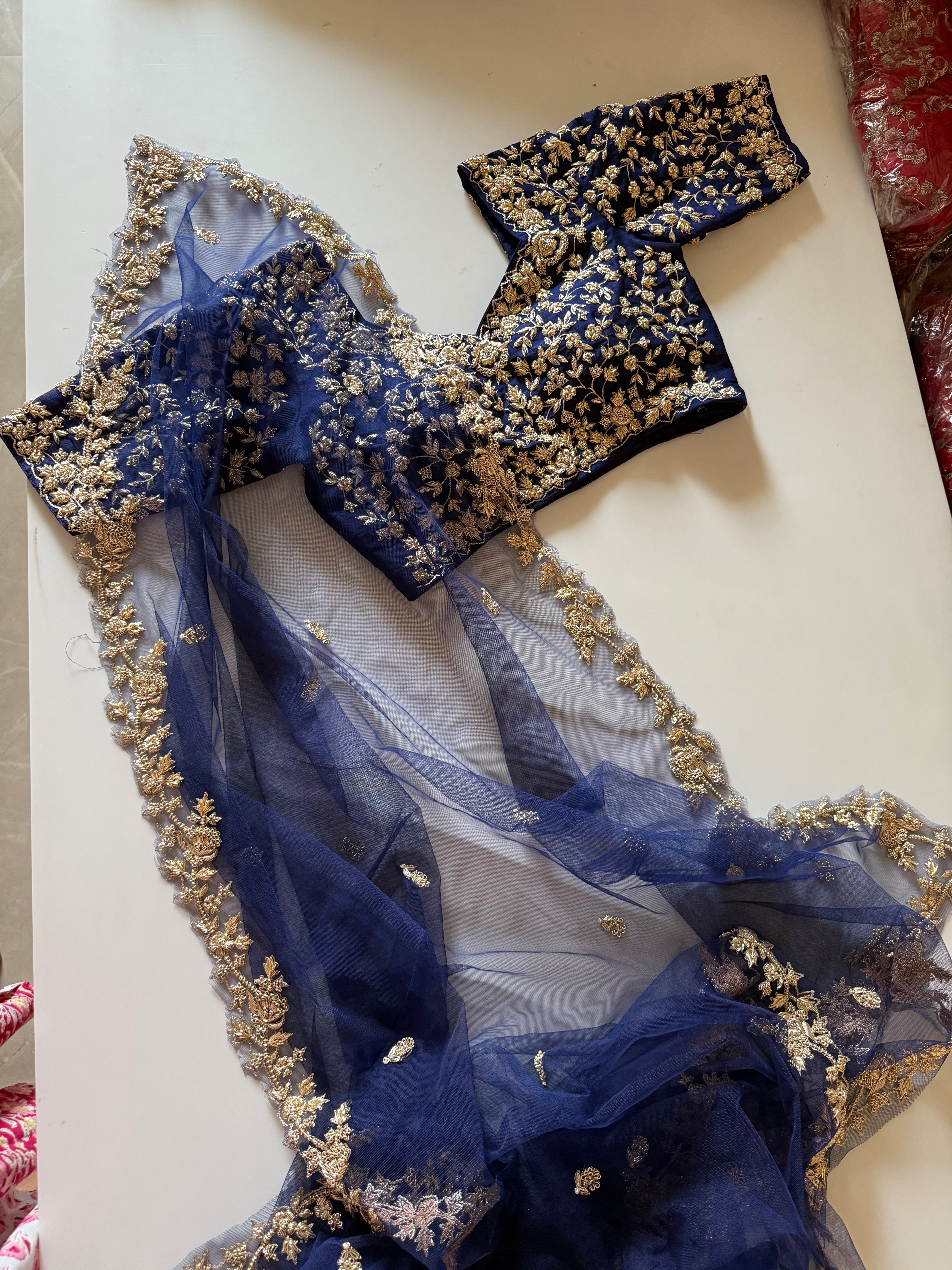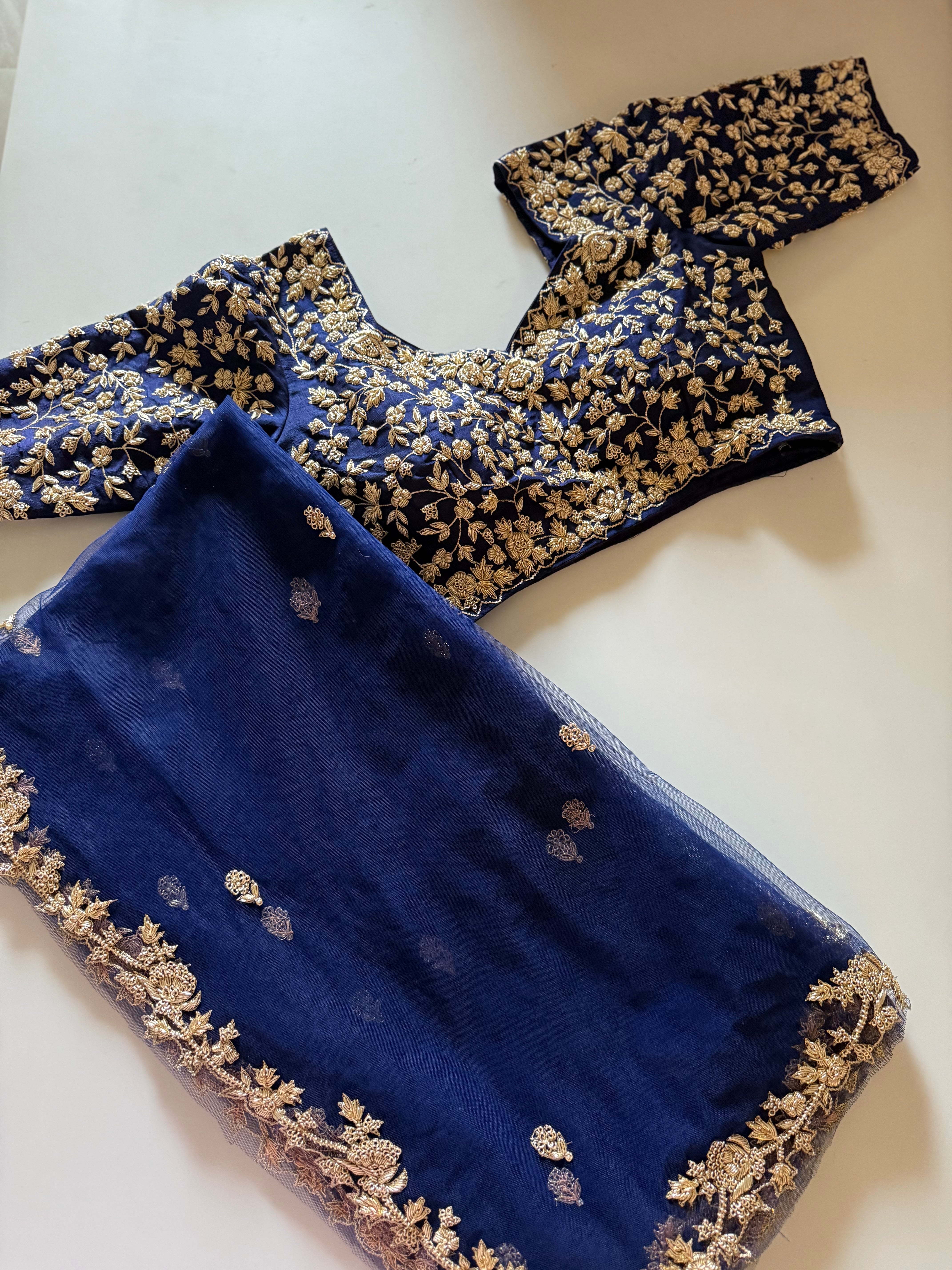 Fine handwork Zardozi heavy raw silk blouse with delicate handwork boarder net saree. ( customisable on organza )  colours customisable  full handwork blouse, front back and sleeves ( blouse will come unstitched )  email us or what’s ap for stitched blouse with all measurements and order no.