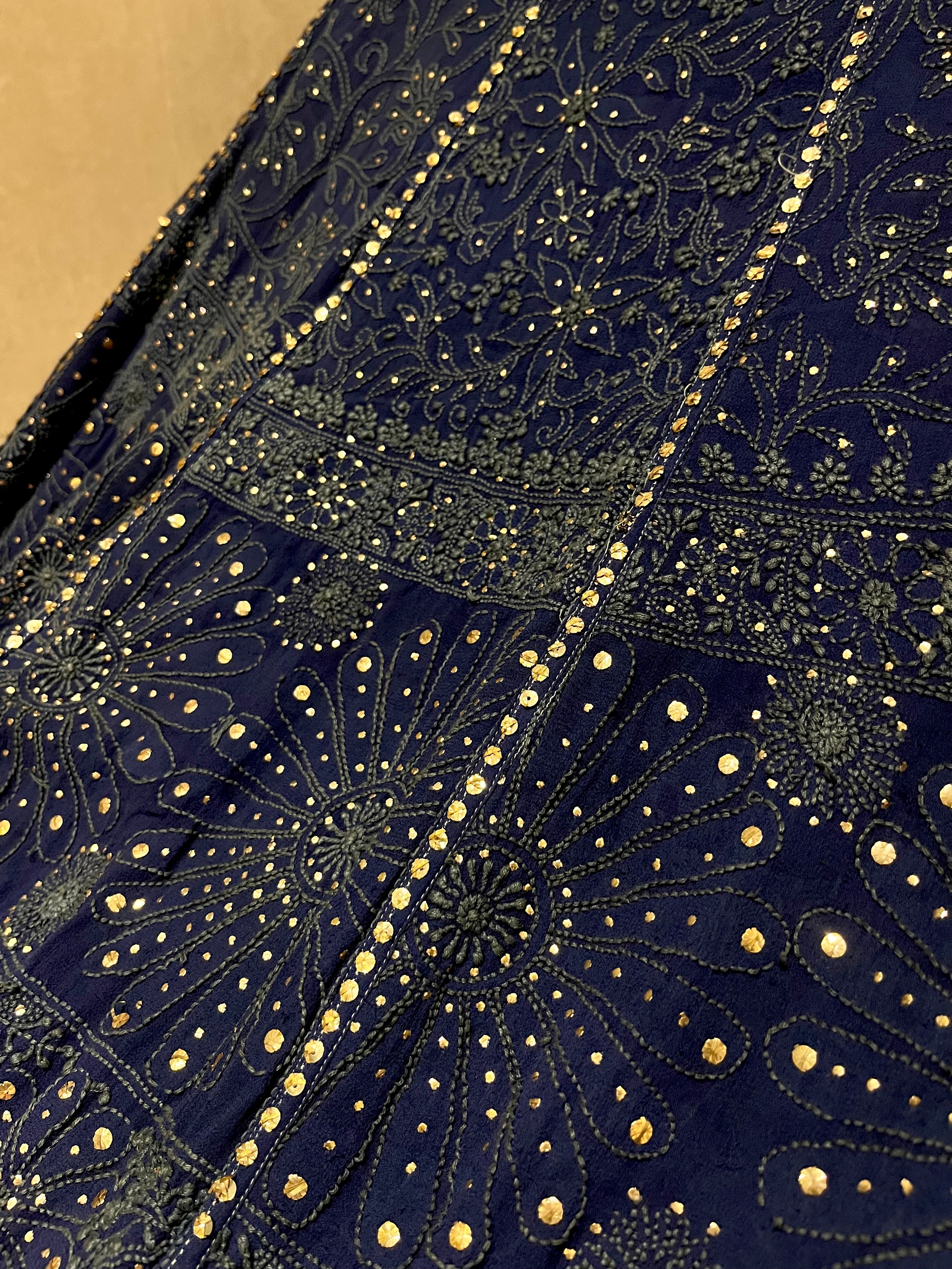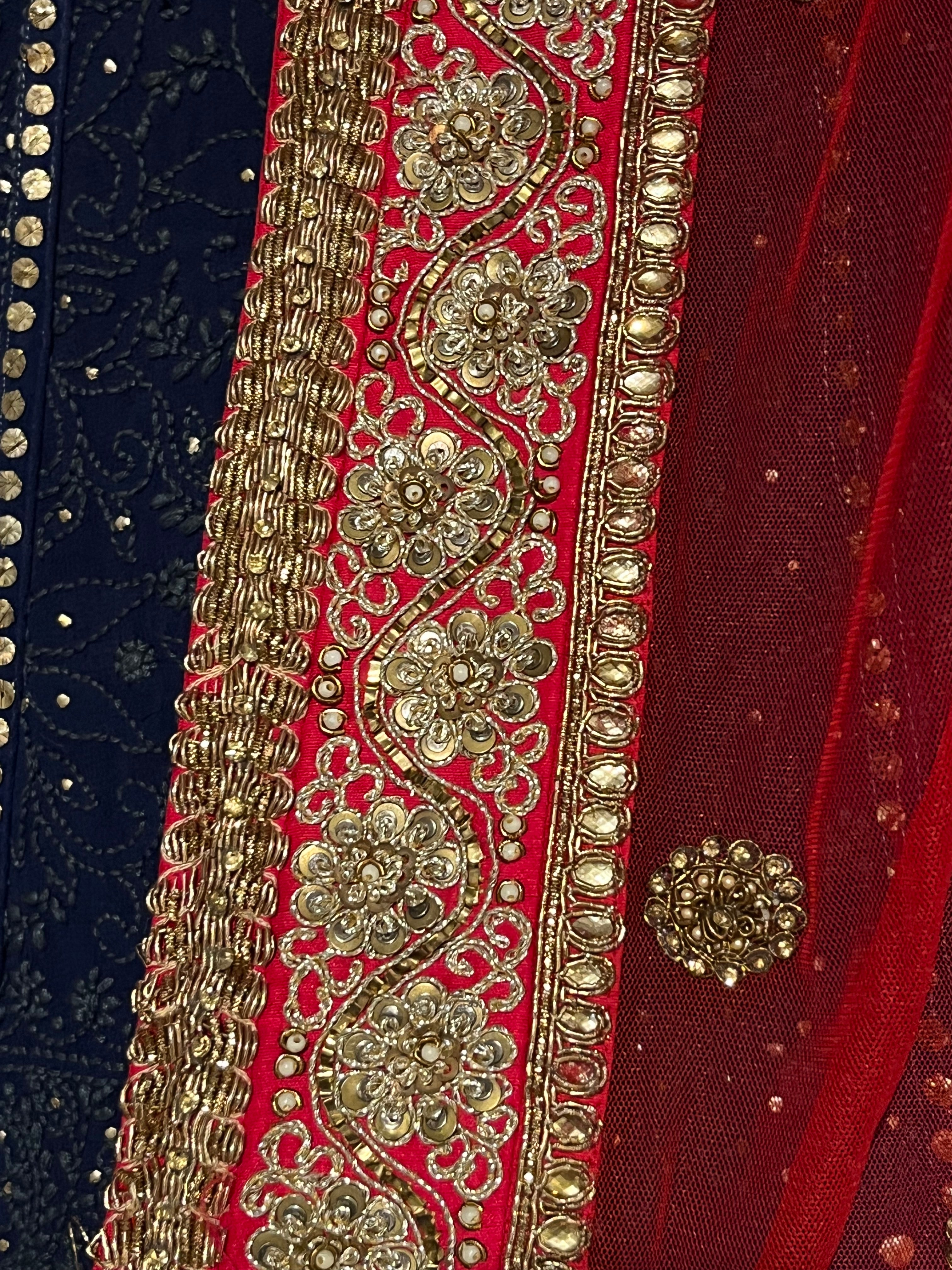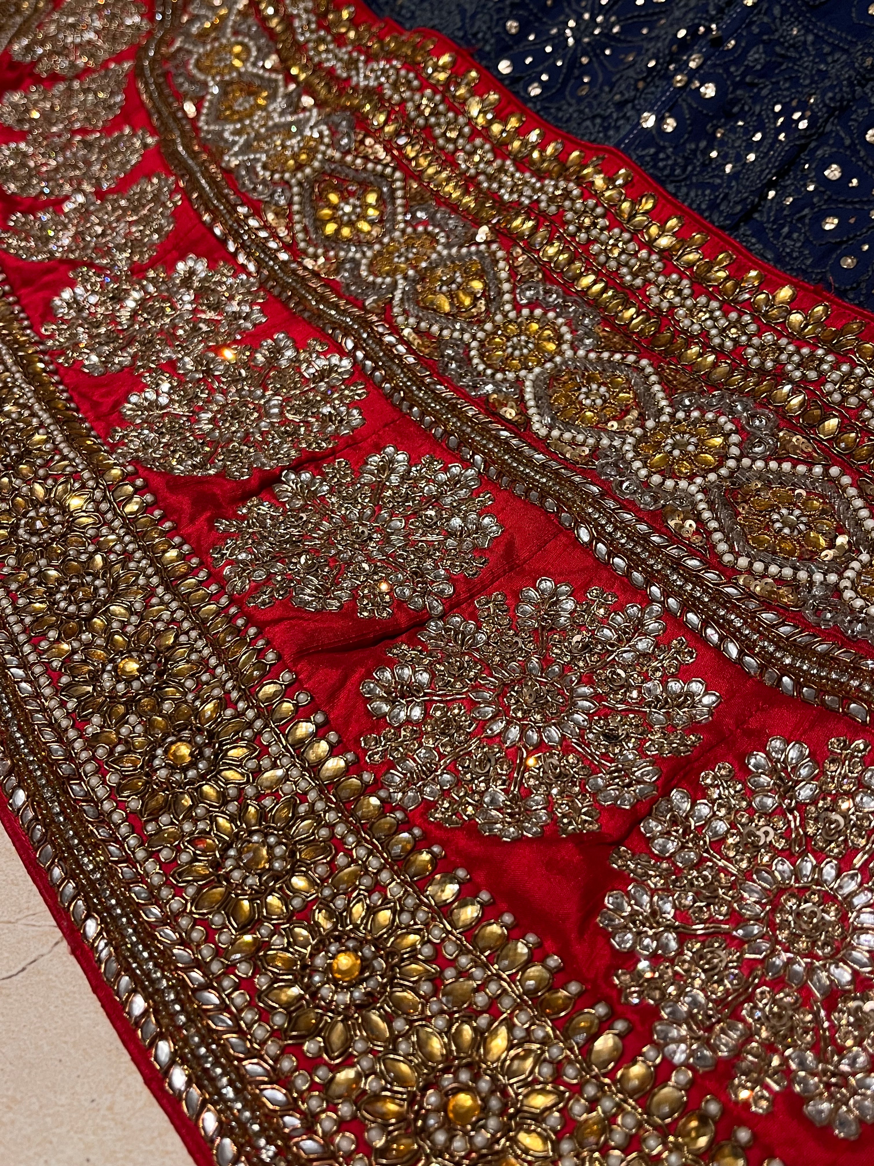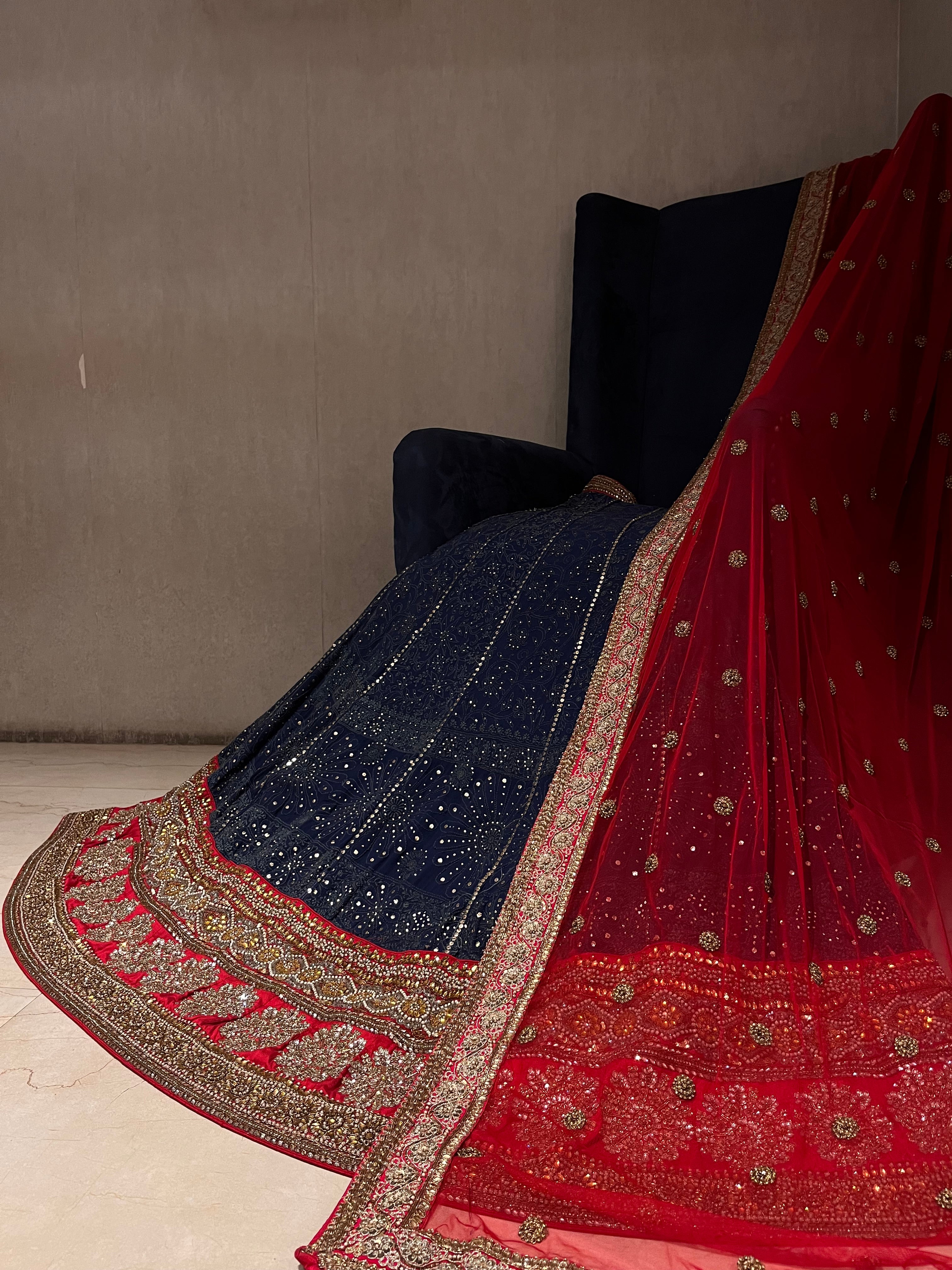 navy blue lucknowi lehenga with contrast dupatta  mukesh handwork allover lehenga  heavy handwork zardozi, sequins, stones and pearls