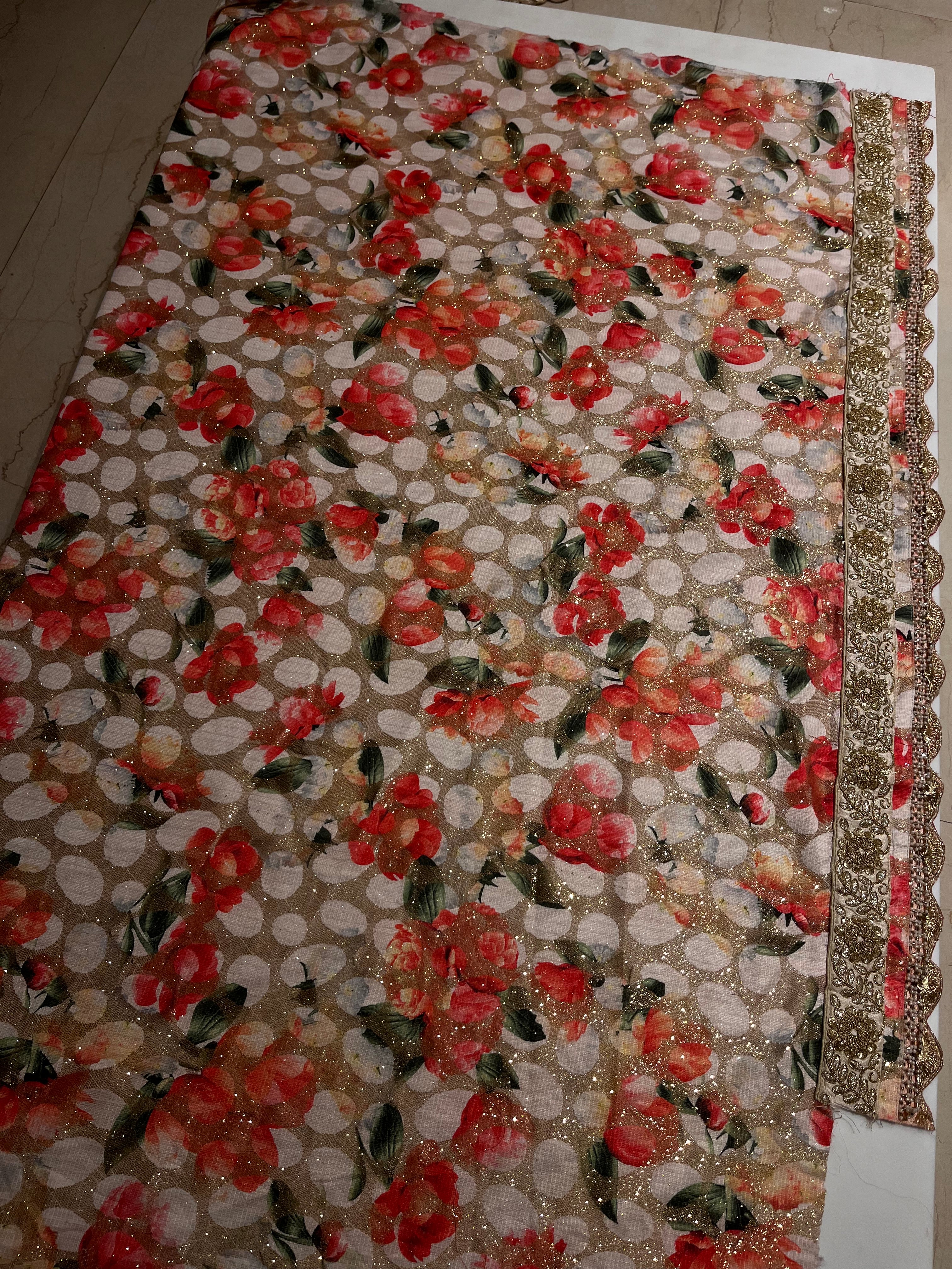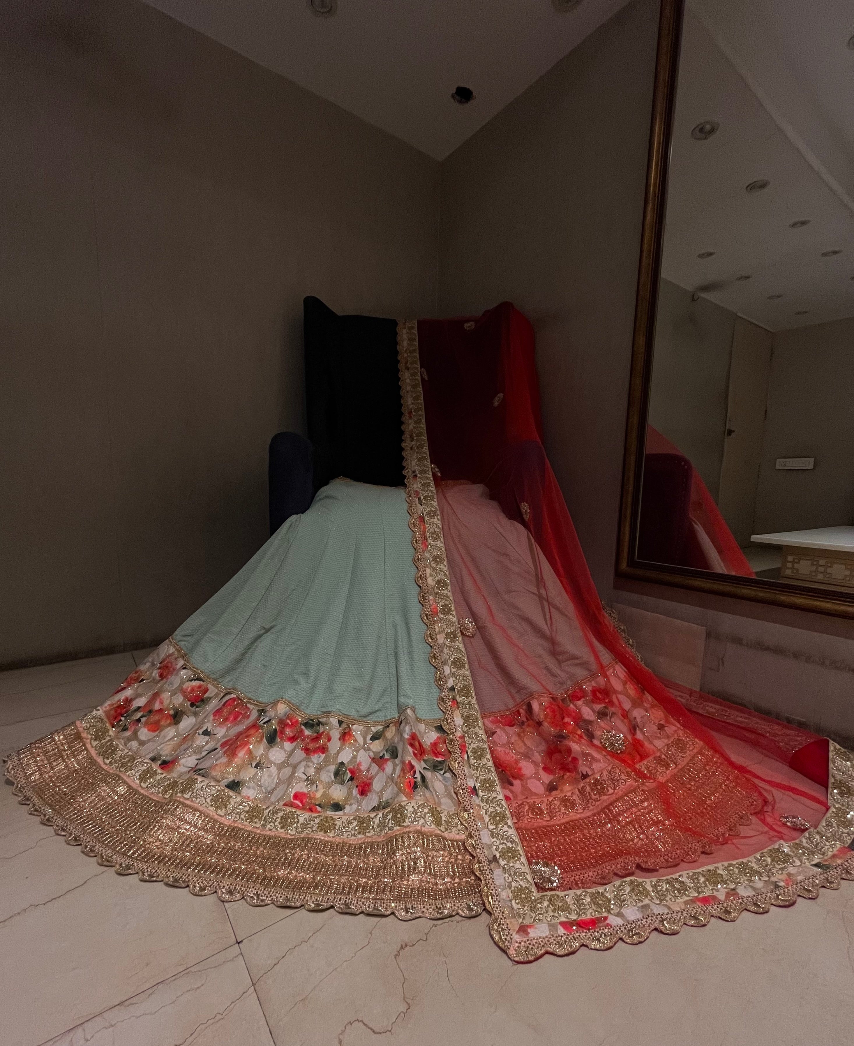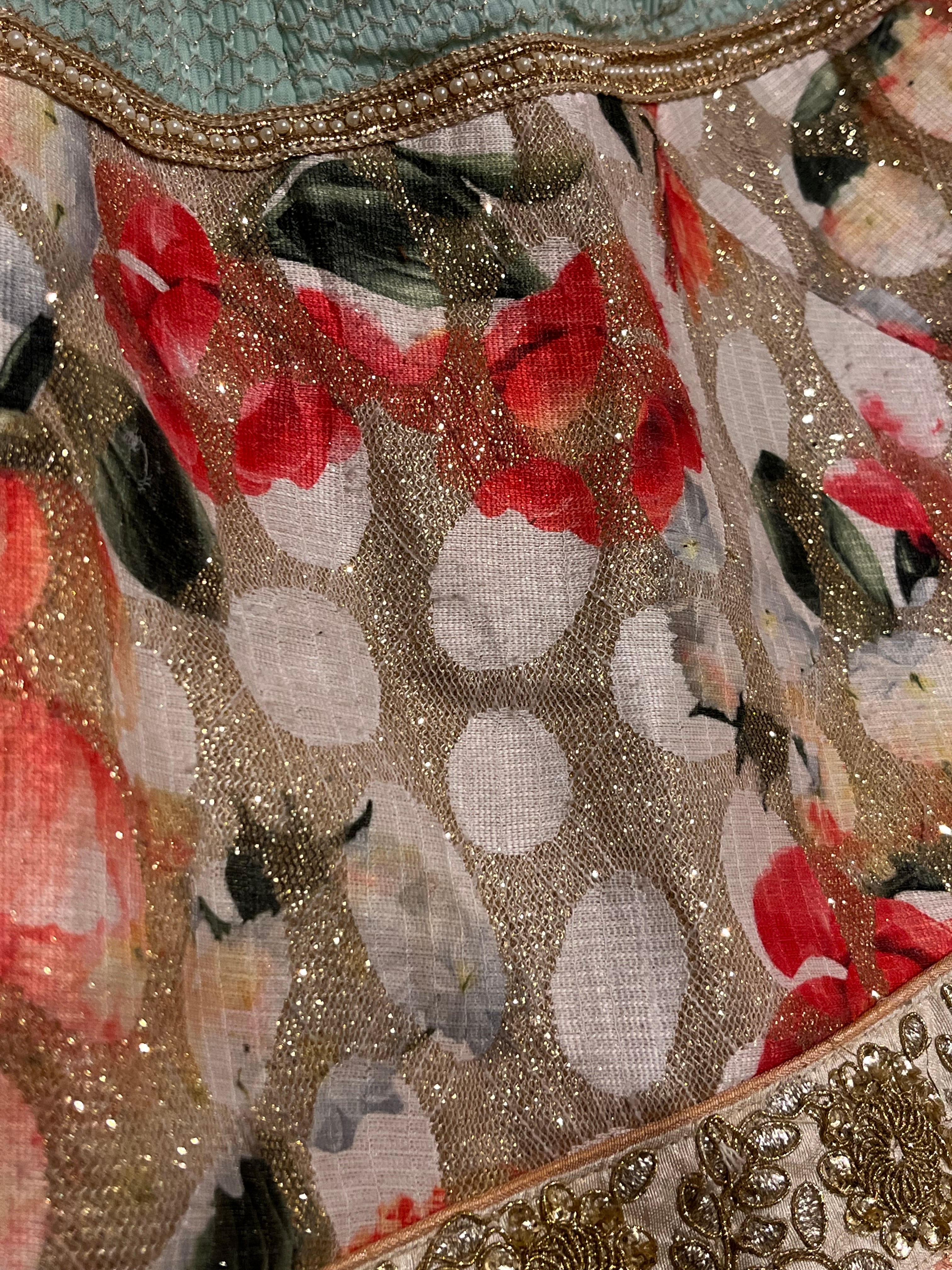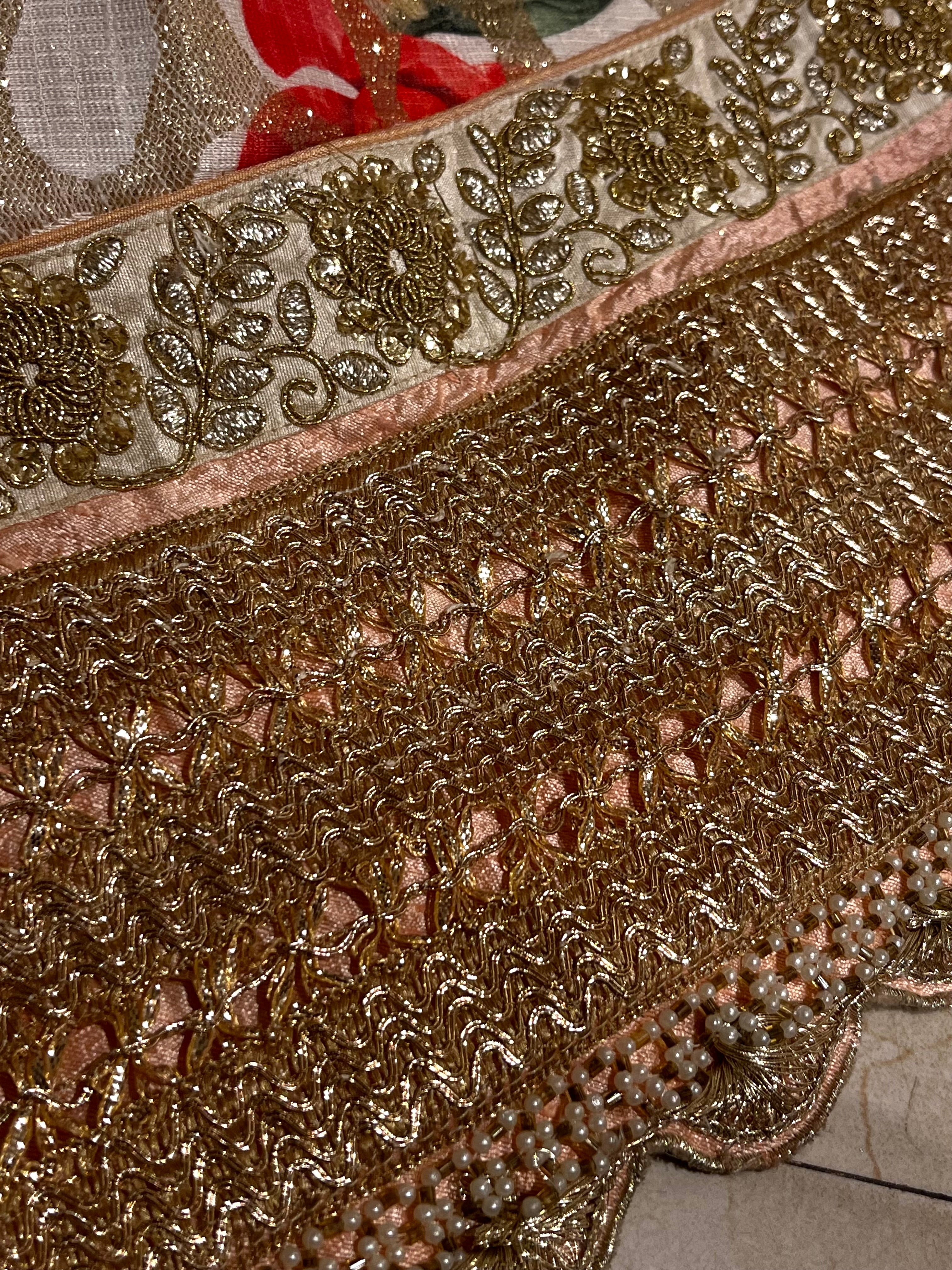 baby blue with peach printed lehenga set  handwork zari and pearl heavy border  peach net dupatta with zardozi, sequins and pearl handwork motifs  printed blouse